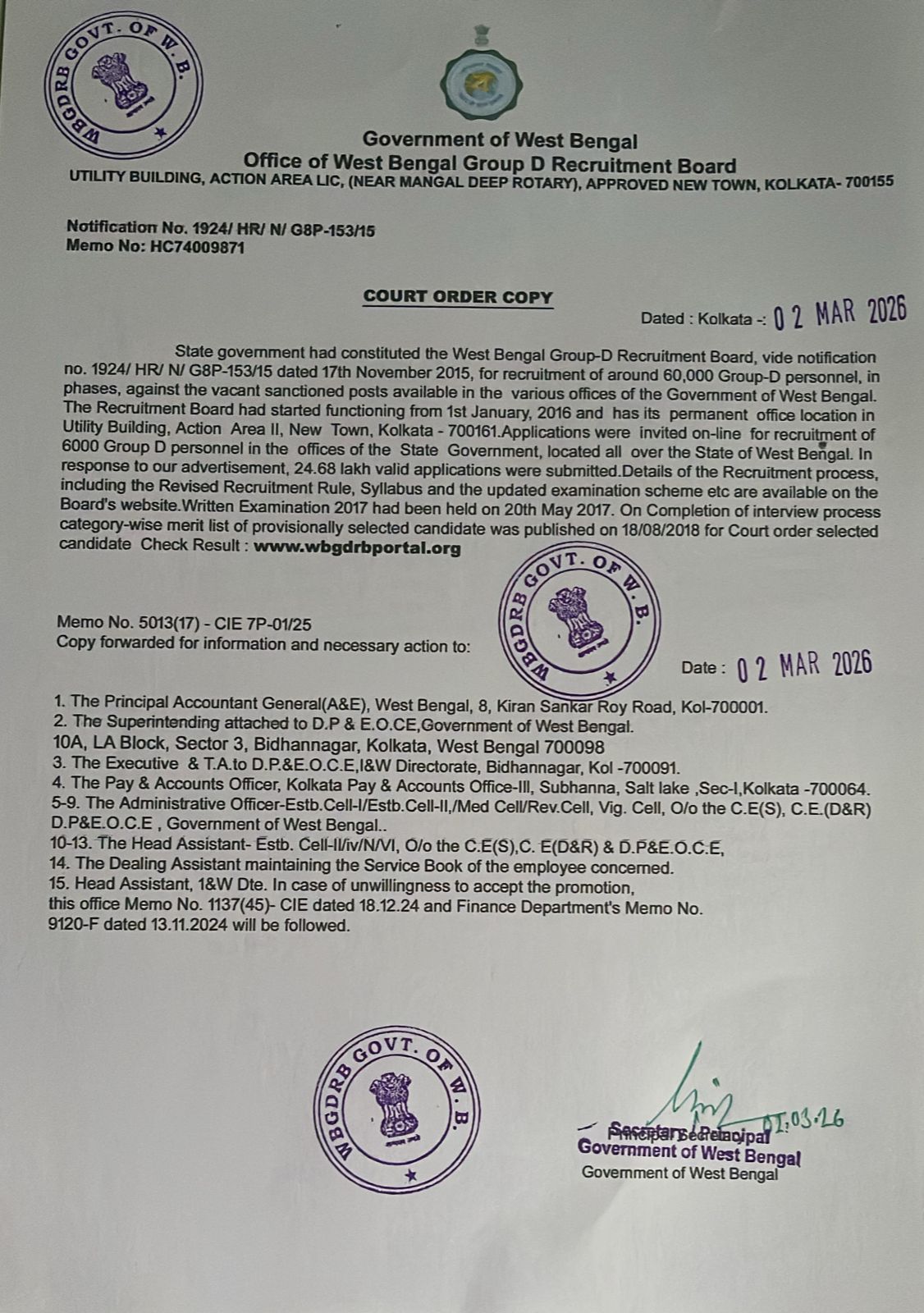 State government had constituted the West Bengal Group-D Recruitment Board, vide notification no. 1924/ HR/ N/ G8P-153/15 dated 17th November 2015, for recruitment of around 60,000 Group-D personnel, in phases, against the vacant sanctioned posts available in the various offices of the Government of West Bengal.